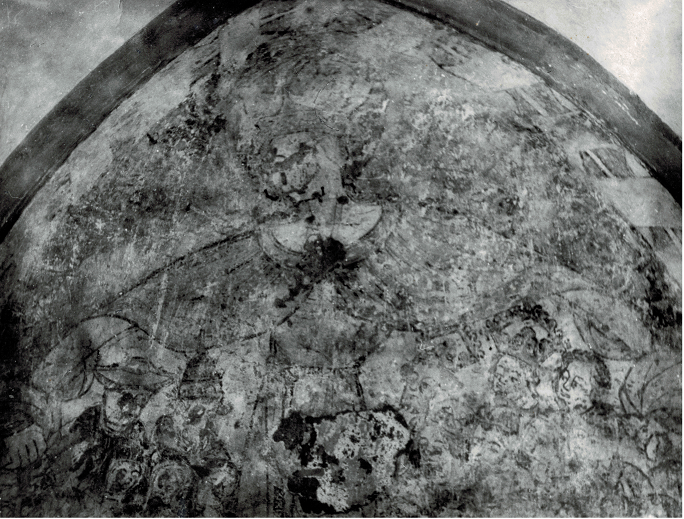 Na této archivní černobílé fotografii je zachycena freska s Pannou Marií Ochranitelkou tak, jak už ji nikdy neuvidíme - na stěně kostela.