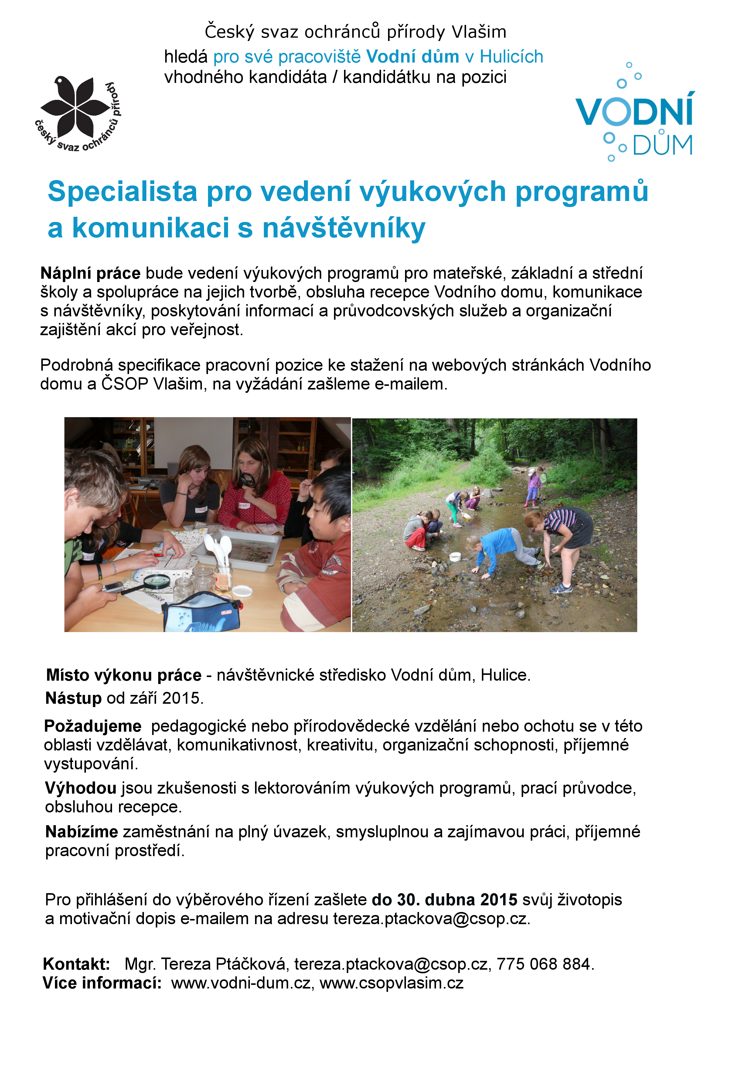 Náplní práce bude vedení výukových programů pro mateřské, základní a střední školy a spolupráce na jejich tvorbě, obsluha recepce Vodního domu, komunikace s návštěvníky, poskytování informací a průvodcovských služeb a organizační zajištění akcí pro veřejnost.