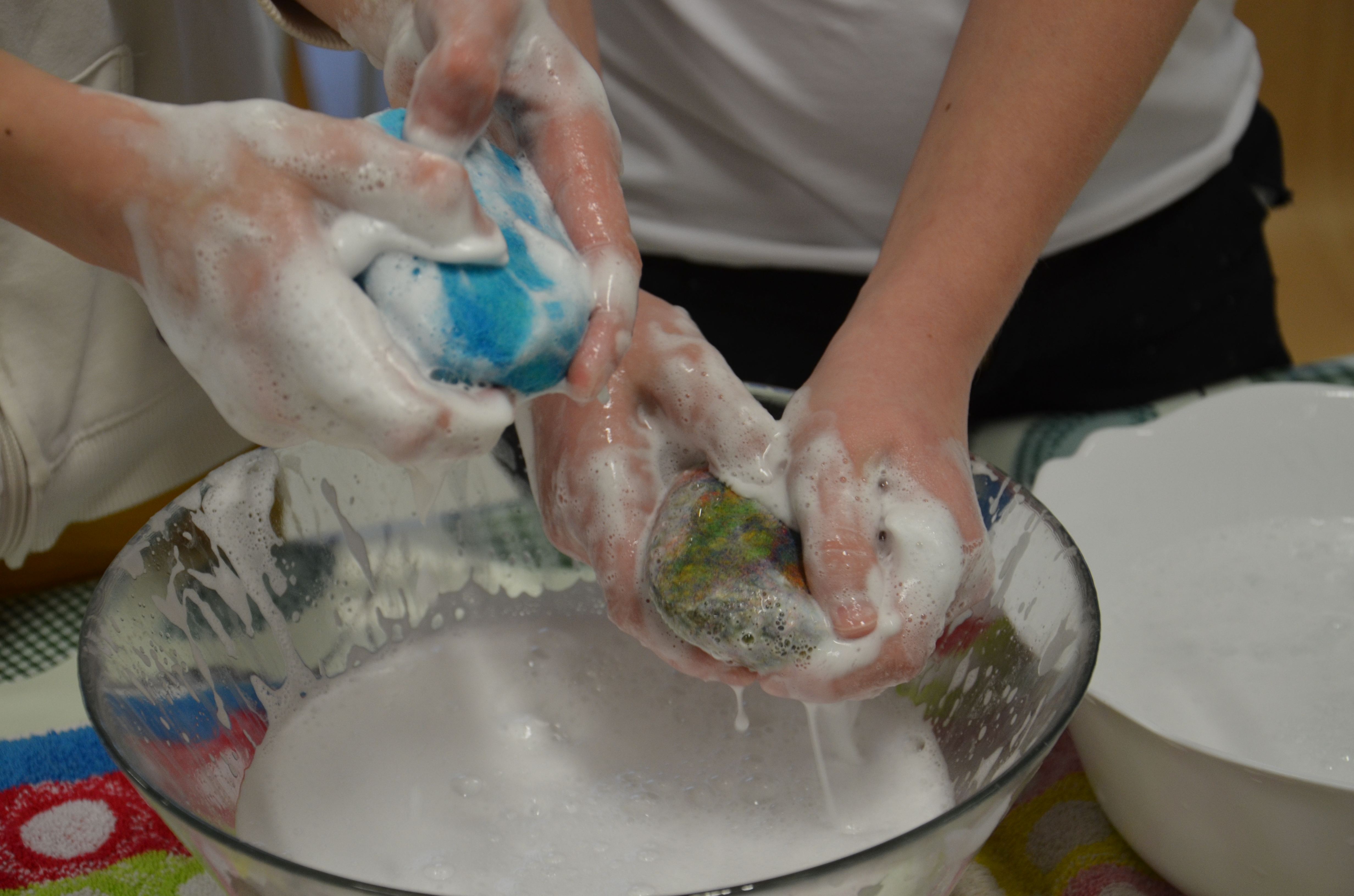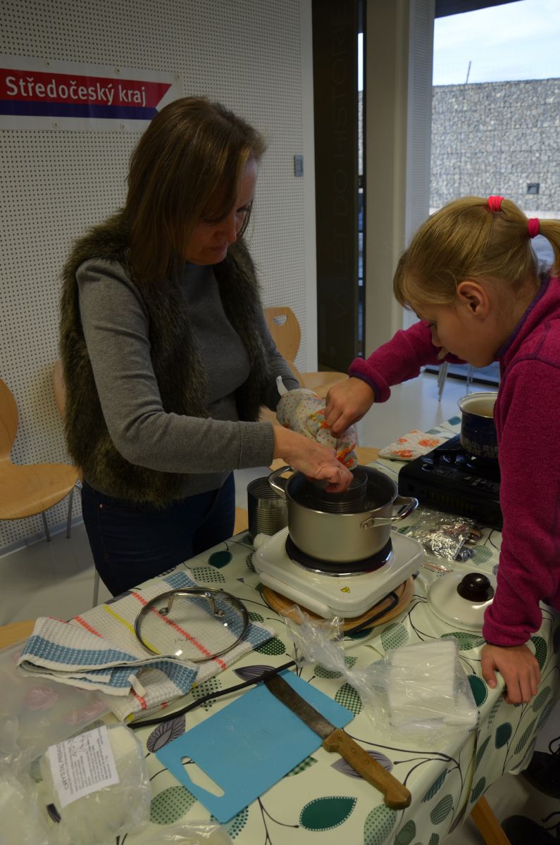 A u mýdel jsme zůstali i na posledním stanovišti. Tam si každý mohl vybrat, jakou barvu, vůni a tvar dá svému originálnímu mýdlu. Výběr to byl někdy těžký, protože možností bylo mnoho. Společně jsme potom bílou nebo průhlednou mýdlovou hmotu rozpustili, obarvili a několika kapkami vonné esence provoněli. Pak už stačilo nalít ji do vybrané formy a vystrčit na pár minut za dveře učebny. I když počasí o víkendu příliš zimní nebylo, přece jen tam mýdla vychladla rychleji než uvnitř.