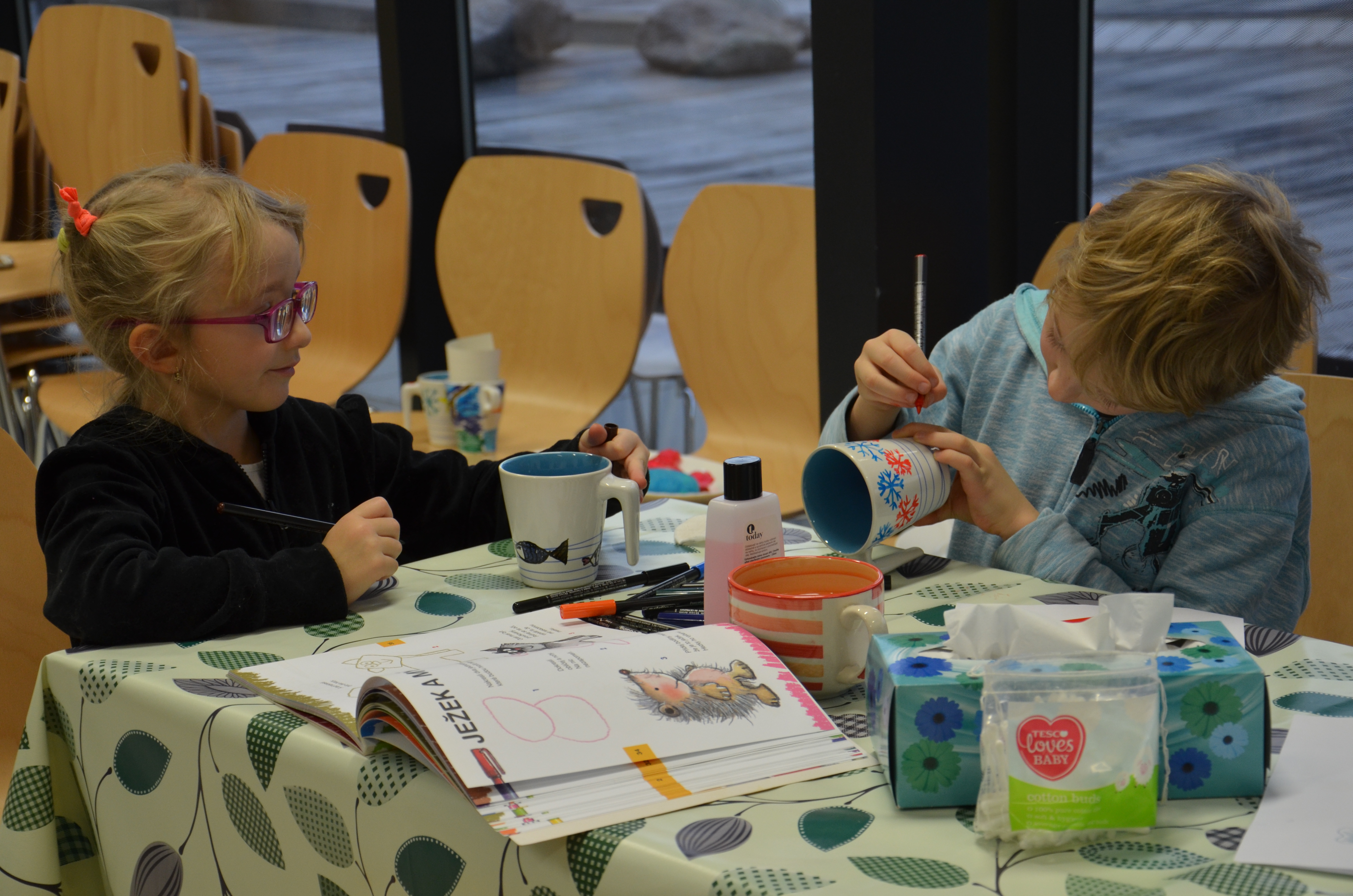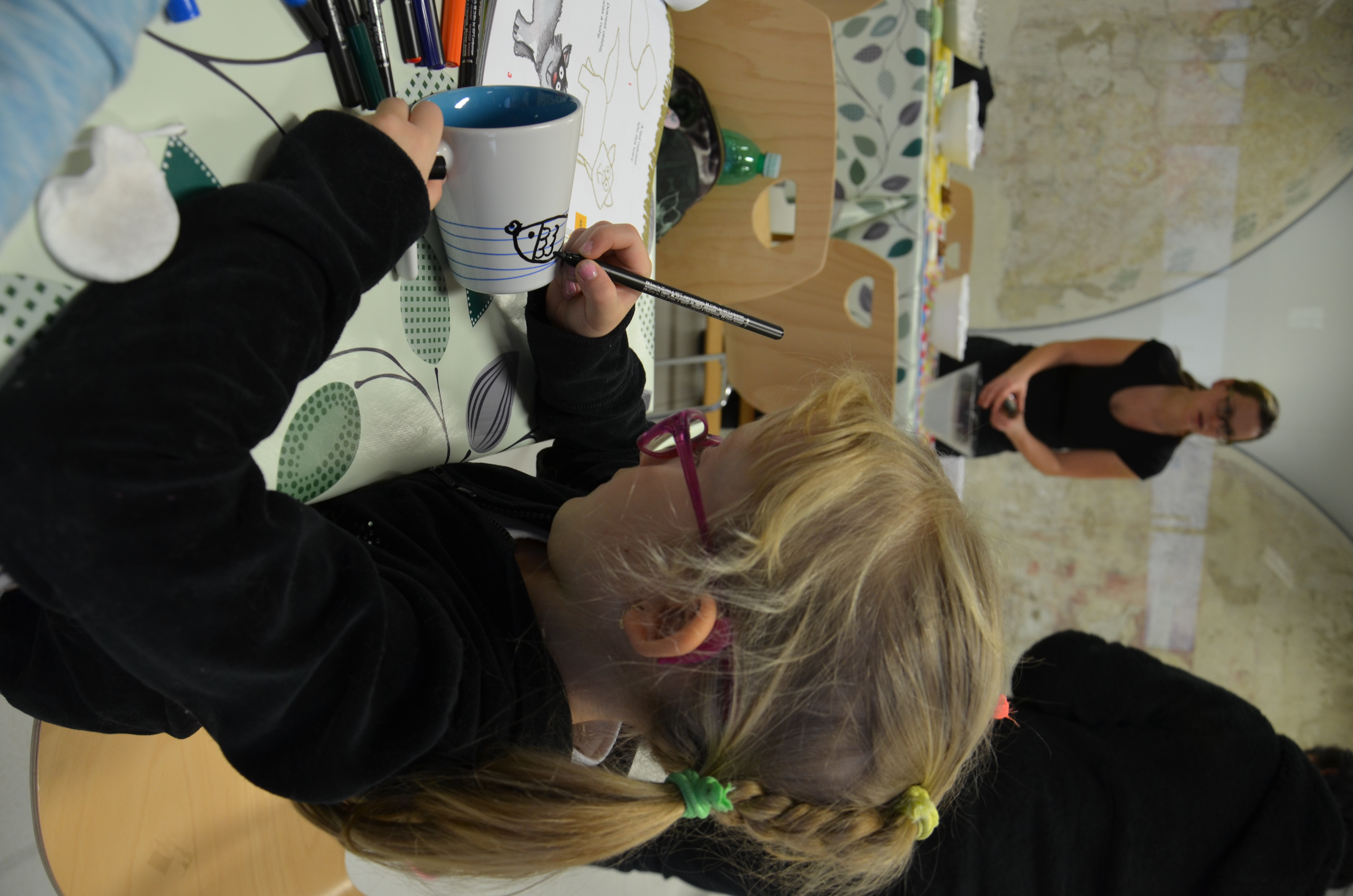 Na prvním stanovišti v naší výukové místnosti se fixami na porcelán malovalo na hrnečky. Máme vyzkoušené, že tato technika je jednoduchá, nepovedené tahy se dají vodou lehce smazat a nikdo se u ní nezašpiní. A když si vyzdobený hrneček doma v troubě zapečete, můžete ho bez obav mýt i v myčce.