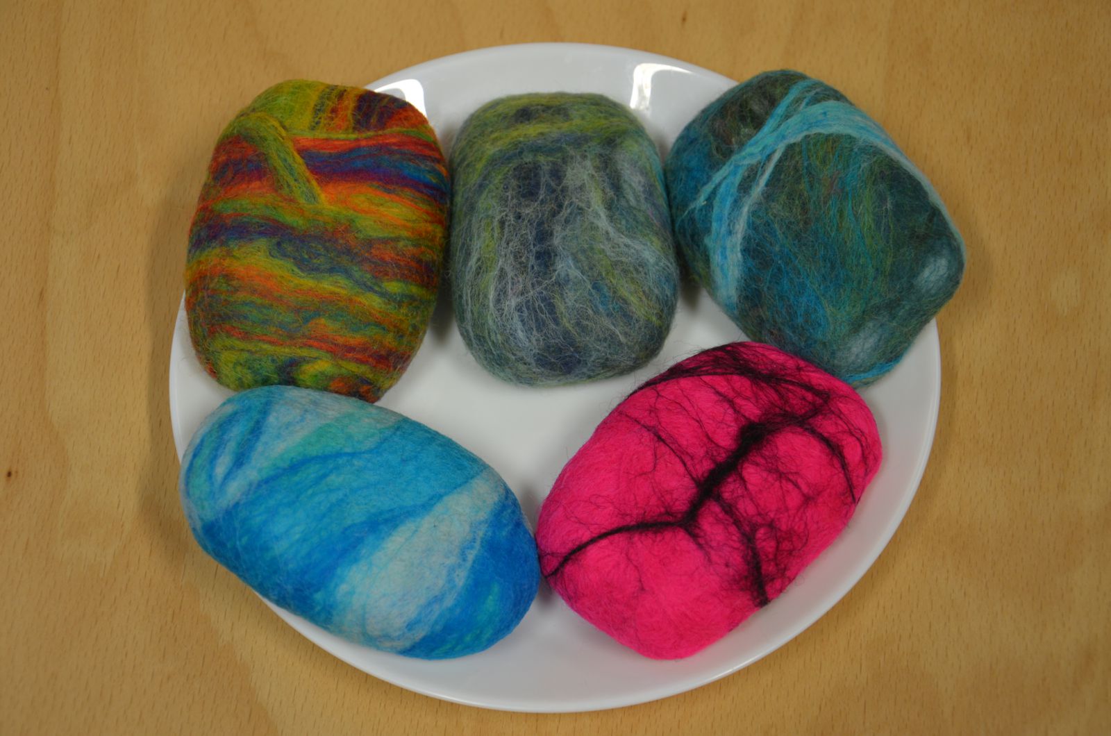 Autor: Mgr. Tereza PtáčkováNa fotografii si můžete pohlédnout, jak krásně barevná mýdla v kabátcích z ovčí vlny se vyráběla technikou mokrého plstění na druhém stanovišti.