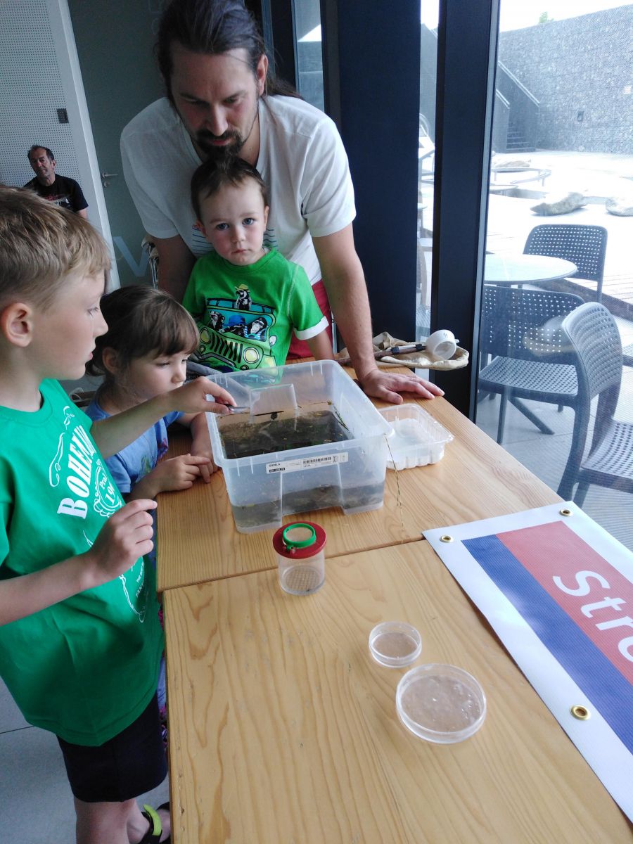 Na tři desítky návštěvníků neodradilo ani zamračené počasí. Bádání začalo u raků, kde si několik odvážných jedinců vyzkoušelo jejich krmením. Potom se malí i velcí seznámili s badatelskými pomůckami, jako jsou např. síťky na lovení nebo krabičkové lupy. A kromě badatelského deníku si odnesli také dovednost, jak pracovat s určovacím klíčem živočichů. Ti nejvytrvalejší si také vyzkoušeli práci s dalekohledem.
