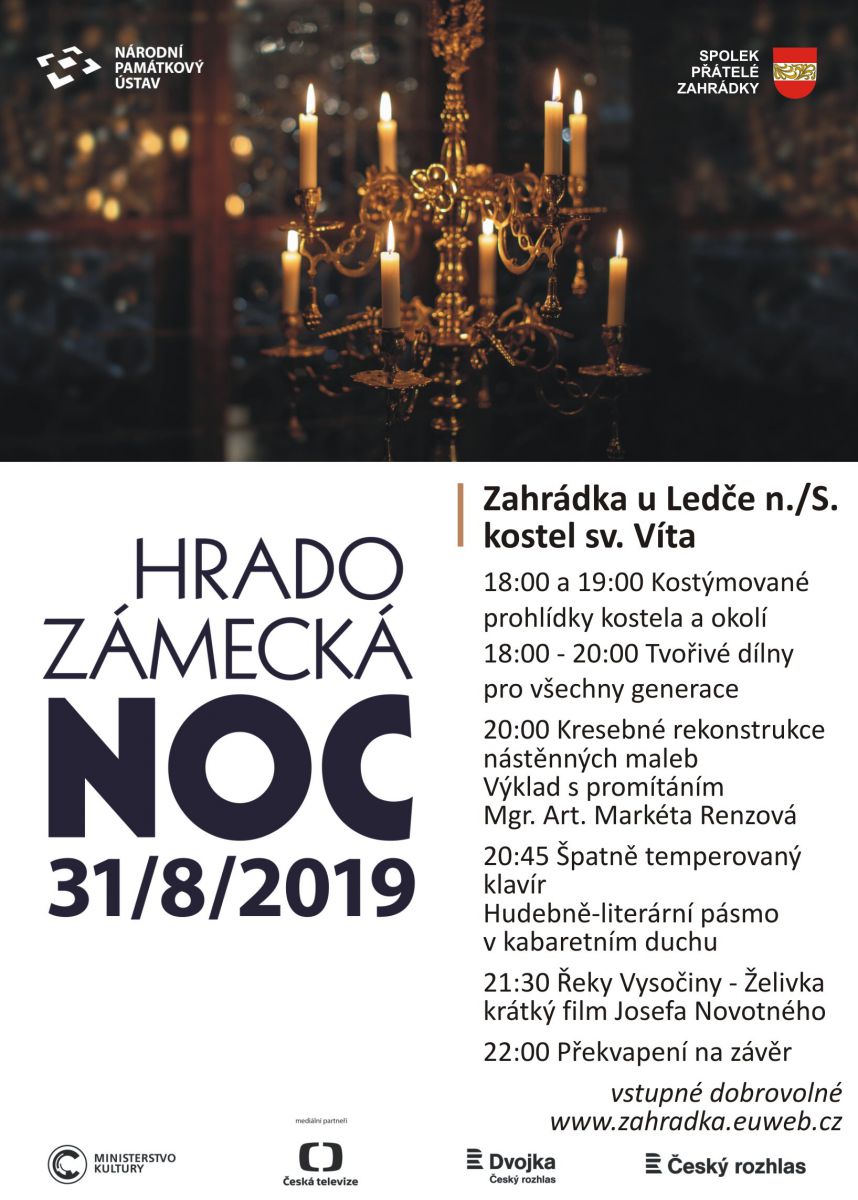 Vážení přátelé, rádi bychom vás pozvali na další ročník Hradozámecké noci v kostele sv. Víta v Zahrádce u Ledče nad Sázavou. Akce se letos koná v sobotu 31.8. V 18 a v 19 hodin se uskuteční kostýmované prohlídky.